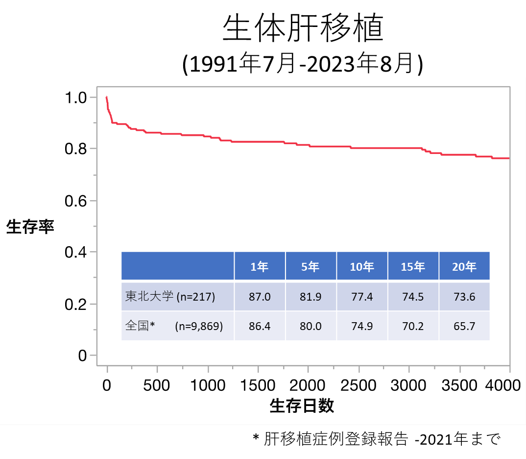 東北大学では1991年7月に生体部分肝移植を成功させて以来、生体・脳死肝移植合わせて238件の肝移植を施行しております(2023年8月現在)。