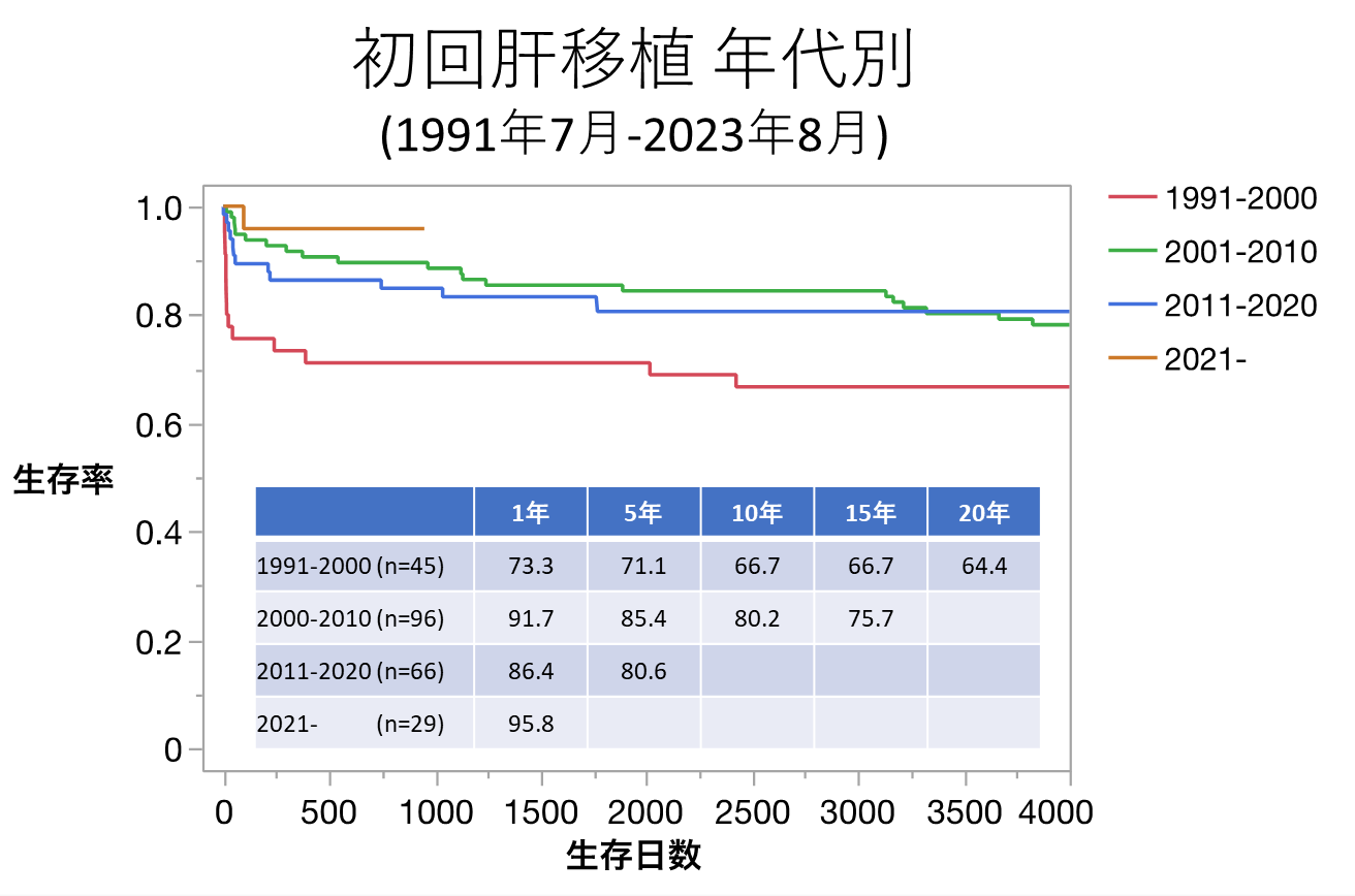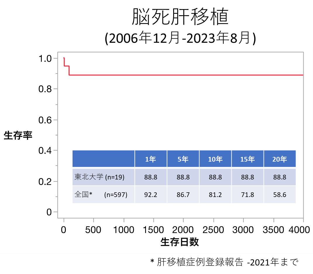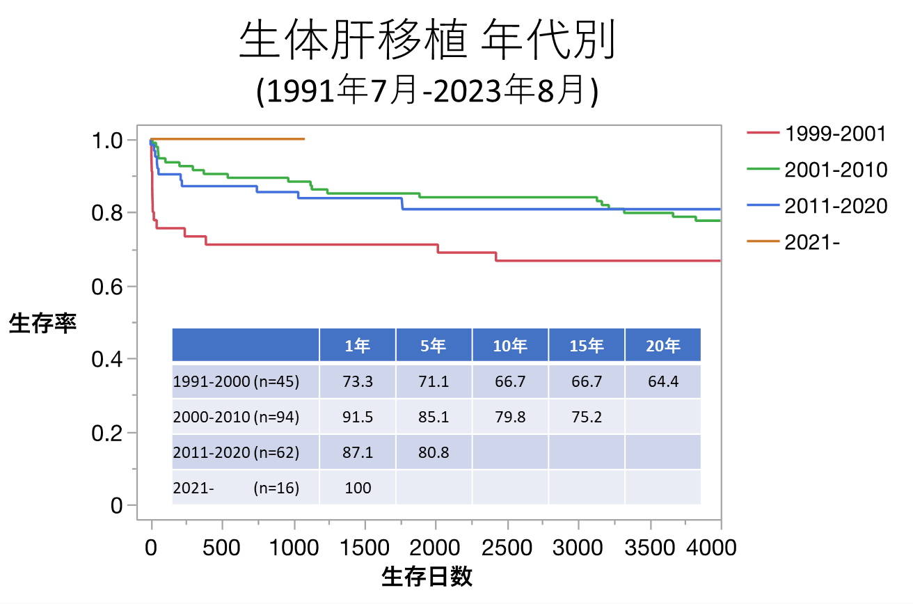 小児肝臓移植の1年生存率は、生体肝臓移植で89.4%、東北大学91.2%、5年生存率で86.8%(東北大学90.1%)です。以前は1歳未満や体重10kg未満の小児は生存率が不良といわれていましたが、最近では、手術手技や周術期管理が向上したため、良好な成績が得られております。