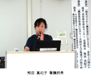看護部の熊田副看護部長からは「臓器提供に関わるということ」というテーマでご講演をいただき、臓器移植支援室の藤盛先生からは「我が国の臓器提供システムの課題と改善の提言」というテーマでご講演をいただきました。また、当部の認定レシピエント移植コーディネーターの佐藤が「レシピエント移植コーディネーターの役割」について講演を行いました。