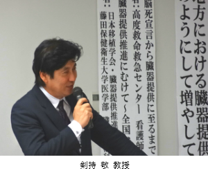 臓器移植症例の執刀を数多く手掛け、長年にわたって移植医療を牽引する第一人者で、臓器提供の普及にも貢献されている、藤田保健衛生大学医学部 臓器移植科 教授 剣持 敬先生を講師にお招きし、『臓器提供推進に向けて~全国および地域での取り組み~』と題した特別講演をいただきました。また、当院救命救急センターの熊田真紀子看護師長には、患者家族を通して見えてきた『脳死宣告から臓器提供に至るまで~家族との関わりから~』と題した教育講演をいただきました。