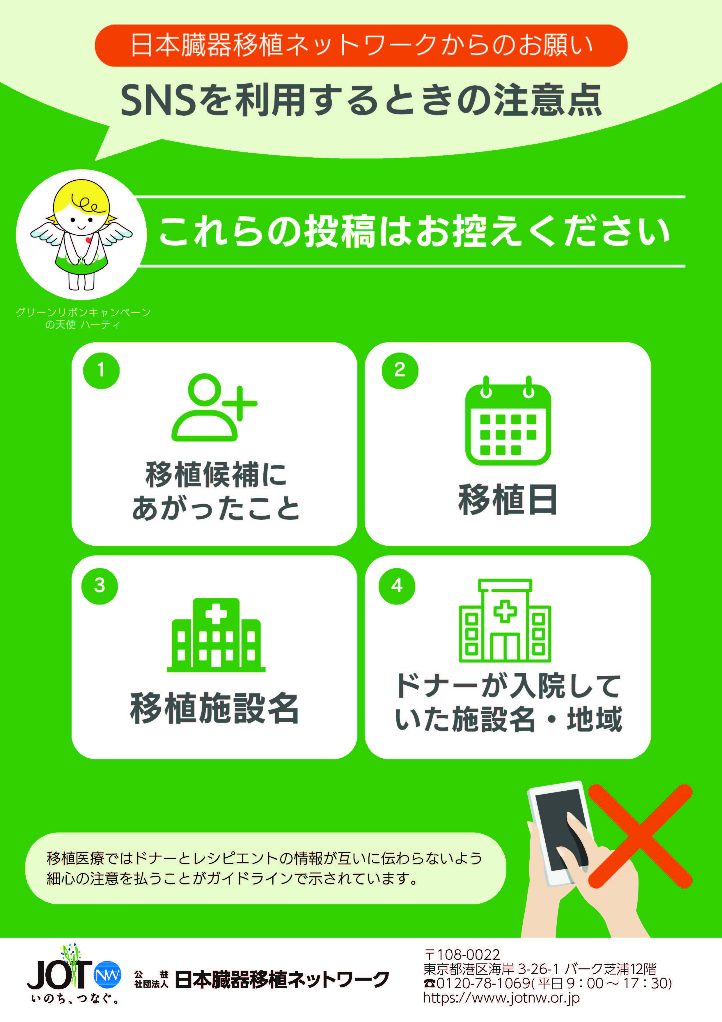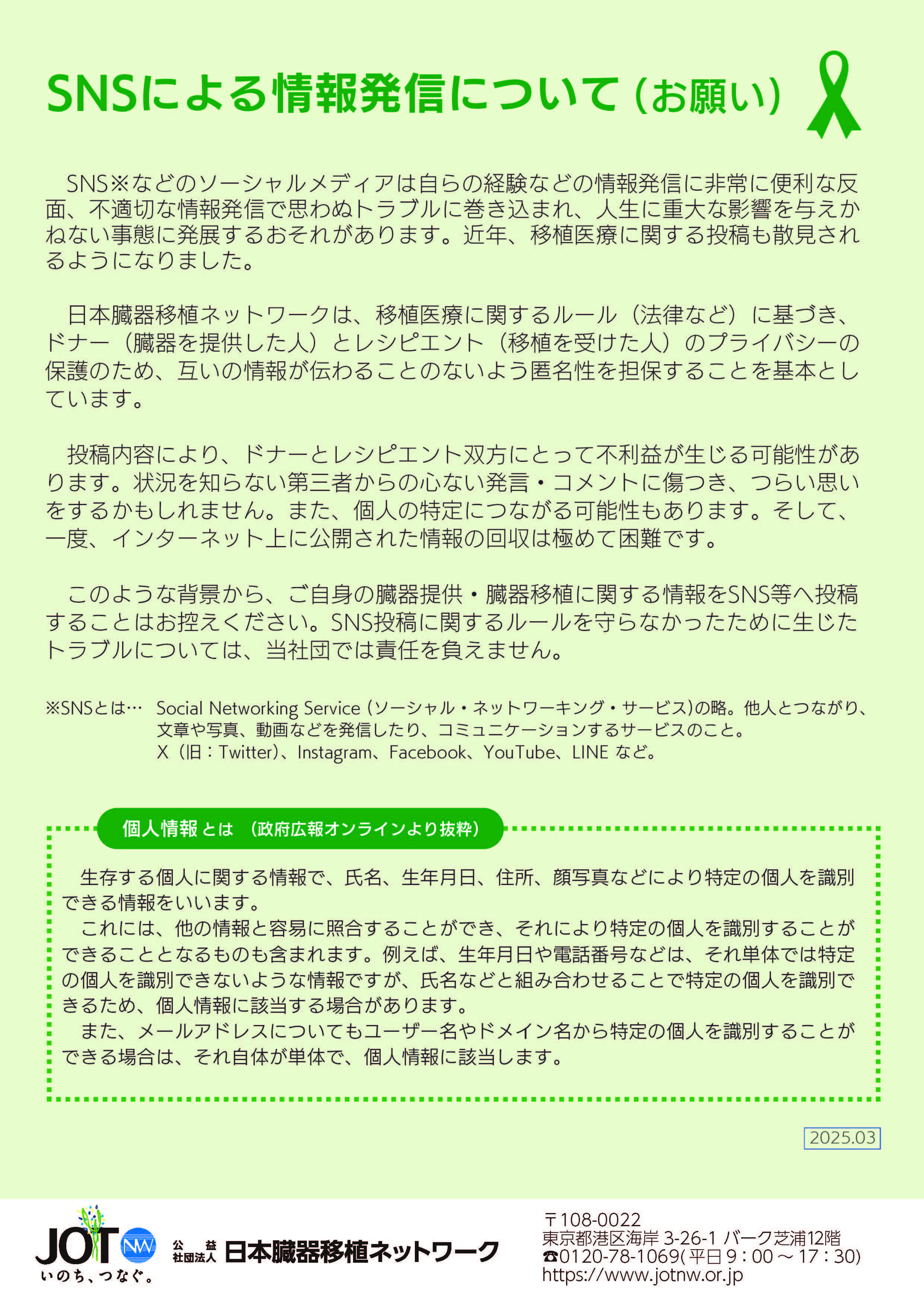 公益社団法人 日本臓器移植ネットワーク >>当事者(ドナー家族、レシピエント)によるSNSでの臓器提供・移植に関する情報発信について(お願い)